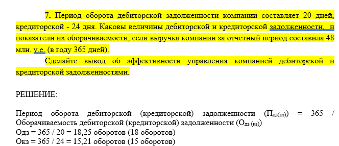 7. Период оборота дебиторской задолженности компании составляет 20 дней, кредиторской - 24 дня. Каковы величины дебиторской и кредиторской задолженности, и показатели их оборачиваемости, если выручка компании за отчетный период составила 48 млн. у.е. (в году 365 дней).