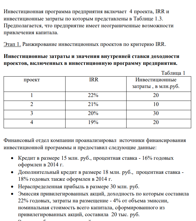 Инвестиционная программа предприятия включает 4 проекта, IRR и инвестиционные затраты по которым представлены в Таблице 1.3. Предполагается, что предприятие имеет неограниченные возможности привлечения капитала. Этап 1. Ранжирование инвестиционных проектов по критерию IRR. Инвестиционные затраты и значения внутренней ставки доходности проектов, включенных в инвестиционную программу предприятия.