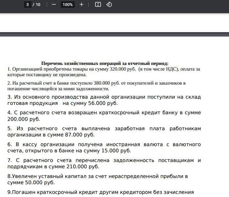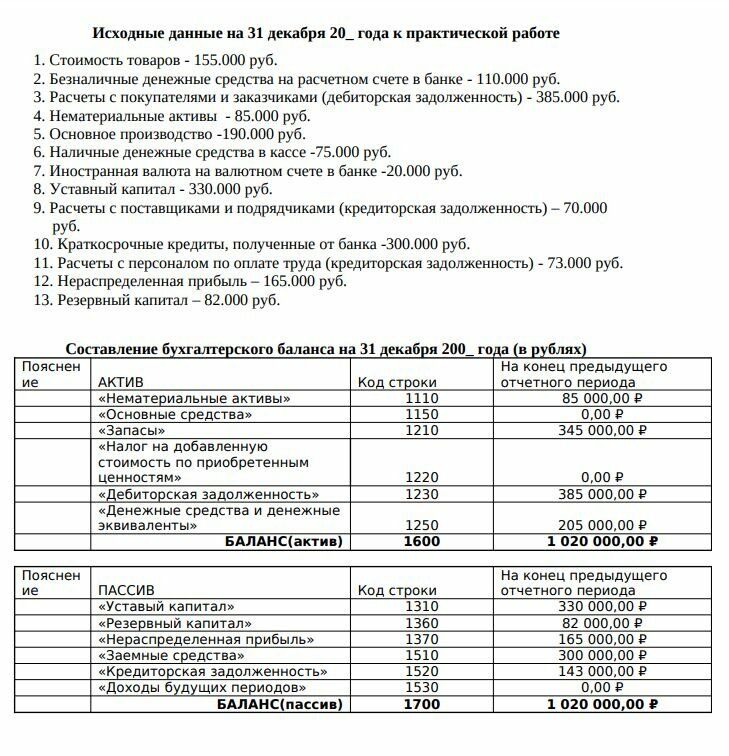 Исходные данные на 31 декабря 20_ года к практической работе 1. Стоимость товаров - 155.000 руб. 2. Безналичные денежные средства на расчетном счете в банке - 110.000 руб. 3. Расчеты с покупателями и заказчиками (дебиторская задолженность) - 385.000 руб. 4. Нематериальные активы - 85.000 руб. 5. Основное производство -190.000 руб. 6. Наличные денежные средства в кассе -75.000 руб. 7. Иностранная валюта на валютном счете в банке -20.000 руб. 8. Уставный капитал - 330.000 руб. 9. Расчеты с поставщиками и подрядчиками (кредиторская задолженность) – 70.000 руб. 10. Краткосрочные кредиты, полученные от банка -300.000 руб. 11. Расчеты с персоналом по оплате труда (кредиторская задолженность) - 73.000 руб. 12. Нераспределенная прибыль – 165.000 руб. 13. Резервный капитал – 82.000 руб.