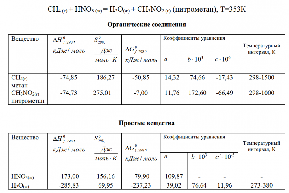 Выполнить расчетную работу по физической химии для заданной реакции CH4 (г) + HNO3 (ж) = H2O(ж) + CH3NO2 (г) (нитрометан), Т=353К