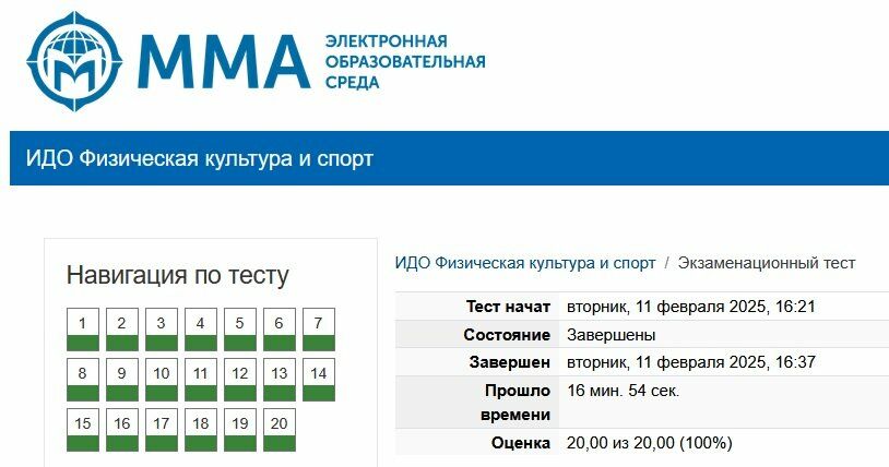 выживание за счет тяжелых потерь 2. защита от незначительного 3. повышение здоровья и эволюция 4. выживание без ухода в стресс Вопрос 15 Как часто рекомендуется проводить 10-дневное оздоровительное голодание по системе ИЗОТОН? 1. раз в год 2. не имеет значения 3. раз в сезон 4. раз в месяц Попытки 2025 г. Попытка 1 Впервые советские спортсмены приняли участие в Олимпийских играх: a. в 1956 г b. в 1960 г c. в 1948 г d. в 1950 г Вопрос 2 Специализированный процесс, содействующий успеху в конкретной деятельности (вид профессии, спорта и др.), предъявляющий специализированные требования к двигательным способностям человека a. физическое совершенство b. профессионально-прикладная физическая подготовка c.