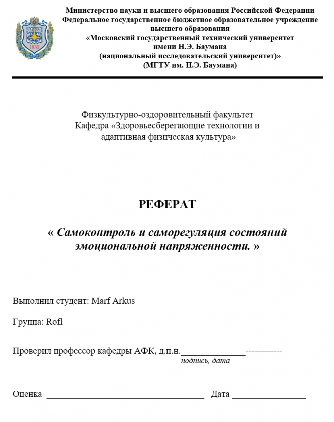 Для студентов МГТУ им. Н.Э.Баумана по предмету Физическая культураАФК: Реферат + презентация. Тема: "Самоконтроль и саморегуляция состояний эмоциональной напряженности ". (нуждается в корректировке по новым правилам АФК: Реферат + презентация. Тема: "Самоконтроль и саморегуляция состояний эмоциональной напряженности ". (нуждается в корректировке по новым правилам