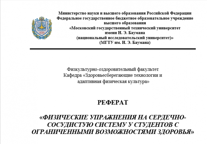 Для студентов МГТУ им. Н.Э.Баумана по предмету Физическая культура«ФИЗИЧЕСКИЕ УПРАЖНЕНИЯ НА СЕРДЕЧНО-СОСУДИСТУЮ СИСТЕМУ У СТУДЕНТОВ С ОГРАНИЧЕННЫМИ ВОЗМОЖНОСТЯМИ ЗДОРОВЬЯ». 5 баллов из 5«ФИЗИЧЕСКИЕ УПРАЖНЕНИЯ НА СЕРДЕЧНО-СОСУДИСТУЮ СИСТЕМУ У СТУДЕНТОВ С ОГРАНИЧЕННЫМИ ВОЗМОЖНОСТЯМИ ЗДОРОВЬЯ». 5 баллов из 5