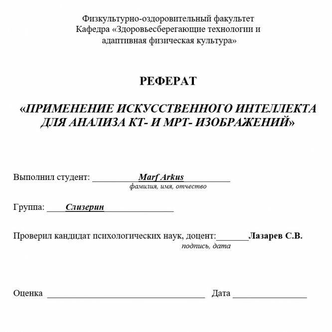Для студентов МГТУ им. Н.Э.Баумана по предмету Физическая культураАФК: Реферат + презентация. Тема: "Применение искусственного интеллекта для анализа КТ- и МРТ- изображений" (Зачтено на максимум: 5/5)АФК: Реферат + презентация. Тема: "Применение искусственного интеллекта для анализа КТ- и МРТ- изображений" (Зачтено на максимум: 5/5)