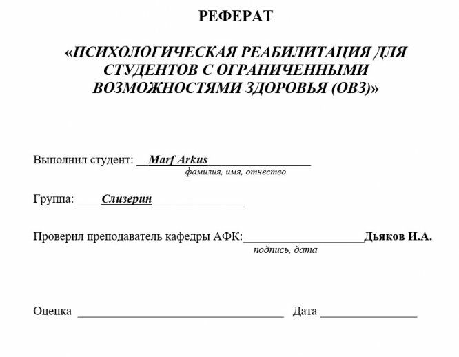 АФК: Реферат + презентация. Тема: " Психологическая реабилитация для студентов с ограниченными возможностями здоровья (ОВЗ) " (Зачтено на максимум: 5/5)