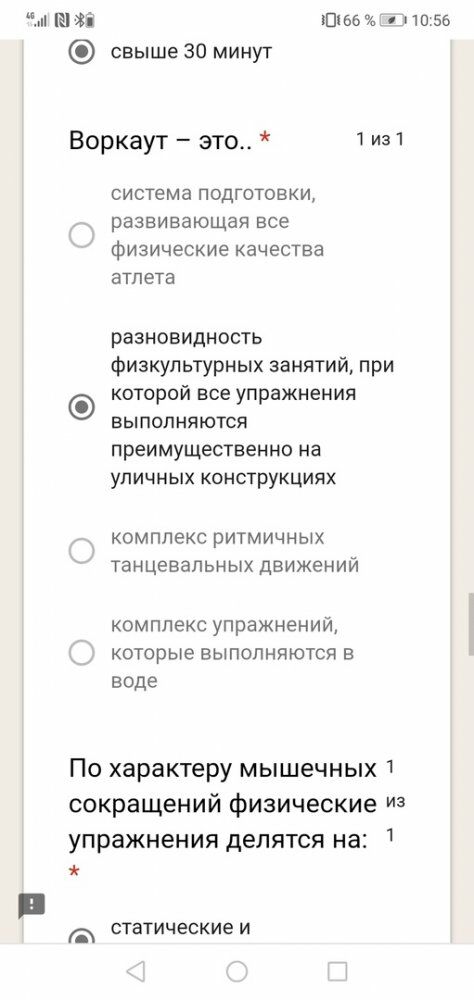 Вопросы: Воркаут - это.. система подготовки, развивающая все физические качества атлета разновидность физкультурных занятий, при которой все упражнения выполняются преимущественно на уличных конструкциях комплекс ритмичных танцевальных движений комплекс упражнений, которые выполняются в воде По характеру мышечных сокращений физические упражнения делятся на: Двигательное умение это: уровень владения знаниями о движениях уровень владения Двигательным действием уровень владения тактической подготовкой уровень владения системо движений Какой из ниже перечисленных показателей относится к субъективным данным самоконтроля: Сколько баллов студент может получить за прилежание при подведении итогов за семестр при условии посещения не менее 70% занятий и при условии записи в учебную группу в течение первой недели текущего семестра: от 1,0 до 3, 0 баллов от 4,0 до 5, 0 баллов от 5,0 до 6, 0 баллов от 6,0 до 8, 0 баллов Назовите оптимальный Двигательный режим для студентов и другие вопросы.