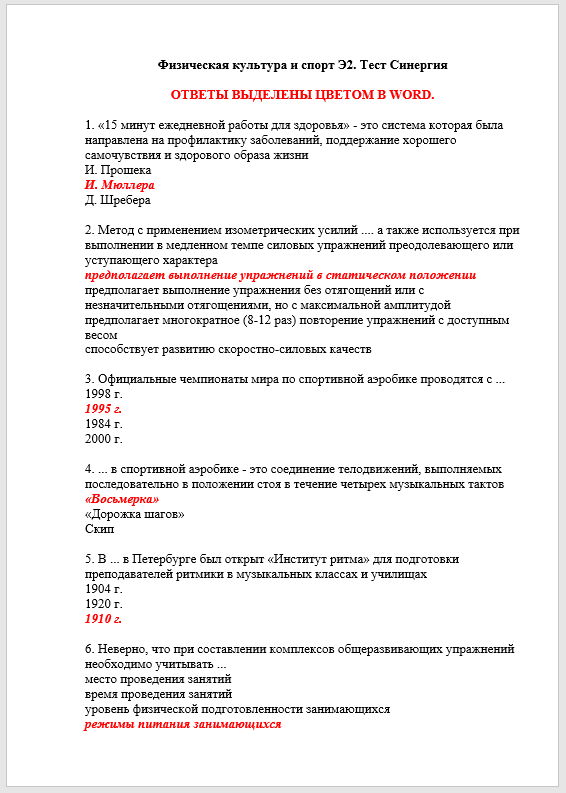 Ответы к контрольной работе: Физическая культура и спорт Э2. Тест Синергия