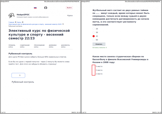 Футбольный матч состоит из двух равных таймов по ..... минут каждый , время которых может быть сокращено , только если между судьей и двумя командами достигнута договоренность до начала матча , и это соответствует регламенту соревнований . Какое место заняла студенческая сборная по баскетболу в финале Всесоюзной Универсиады в Казани в 2008 году : Какие утверждения верны для футболистов ? Какие минимальные размеры футбольного поля для проведения официальных матчей ? Ворота должны размещаться ... Сколько весит футбольный мяч ? [ Баскетбол ] Неправильный персональный контакт игрока с мячом или без мяча толчком или движением в туловище соперника , называется : Если игрок умышленно забрасывает мяч в корзину своей команды , это : Учавствовали футболисты МГТУ им .