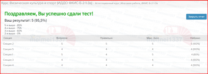 Ответы к экзамену Итоговый тест: Курс Физическая культура и спорт - Аттестационный курс Итоговая работа 95%