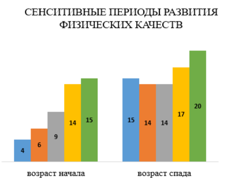 Каждое физическое качество имеет свои сенситивные периоды развития. Посмотрите внимательно на график и выберите из выпадающего списка вид качества, которому соответствует данный цвет на графике.