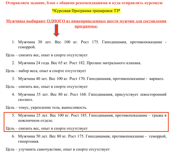 Мужчина 25 лет. Вес 100 кг. Рост 185 Гиподинамия, противопоказание – грыжа в поясничном отделе.