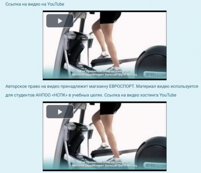 Эллипсоид — это удобный тренажер, предназначенный для домашних тренировок и занятий в тренажерном зале. Чтобы заниматься на эллиптическом тренажере правильно, необходимо знать правила, соблюдать технику безопасности и некоторые рекомендации. Внимательно посмотрите видеоролик об эффективной организации тренировки на орбитреке. Ссылка на видео на YouTube Выберите из выпадающего списка правильные ответы на вопросы к видео. Вопросы к видеоВариант ответа 1Какой прием работы на тренажере увеличивает эффективность тренировки? 2Что обеспечивает достижение комплексной нагрузки на организм при занятиях на тренажере? 3Какая функция на тренажере показывает, какие мышцы задействованы в процессе тренировки? 4Какие рекомендации необходимо соблюдатьзанимающимся низкого роста, чтобы избежать эффекта «перешагивания»? 5Какой вид нагрузки при работе на тренажере обеспечивает тренировку сердечно- сосудистой системы? 6Каким видом нагрузки при работе на орбитреке достаточно заниматься один раз в неделю? Вам предстоит подготовить и выступить с докладом по теме «Закономерности силовой тренировки».