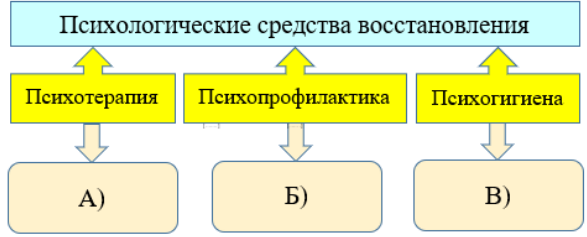 Перед вами схема классификации психологических средств восстановления работоспособности и их перечень. Разделите перечень средств по категориям классификации, для этого впишите соответствующие цифры в свободное поле под категорией в схеме, по порядку, без пробелов и запятых.