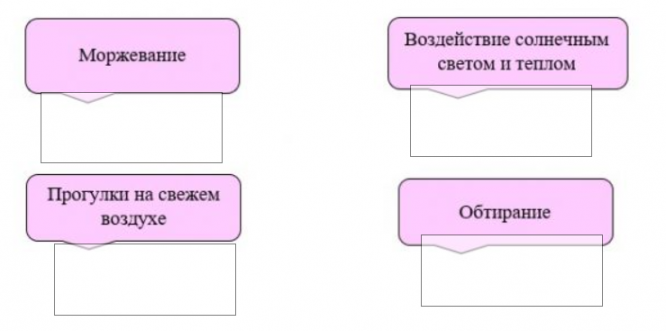Установите соответствие между видом закаливания и его примером. Для этого составьте пары из двух блоков, переместив пример закаливания на вид закаливания.