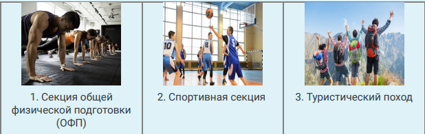Вам предложены фотоизображения нескольких вариантов досуга, направленных на физическое воспитание, а значит на оздоровление организма человека. Определите, какая из представленных деятельностей физического воспитания направлена не только на широкую двигательную подготовку, но и на комплексное развитие физических качеств. Впишите правильный ответ цифрой, соответствующей вашему выбору.