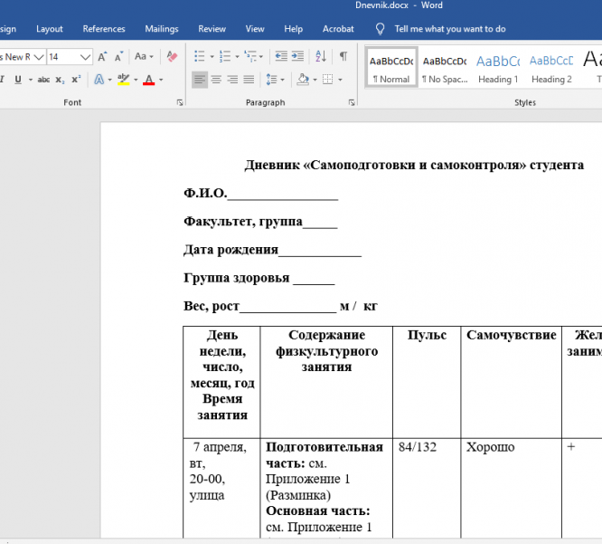Для студентов МГТУ им. Н.Э.Баумана по предмету Физическая культураДневник самоподготовки: основная группа №2 (word) (2020г)Дневник самоподготовки: основная группа №2 (word) (2020г)