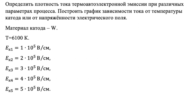 Определить плотность тока термоавтоэлектронной эмиссии при различных параметрах процесса. Построить график зависимости тока от температуры катода или от напряжённости электрического поля.