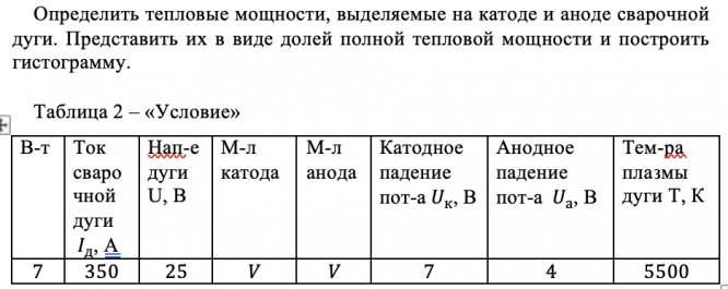Определить тепловые мощности, выделяемые на катоде и аноде сварочной дуги. Представить их в виде долей полной тепловой мощности и построить гистограмму.
