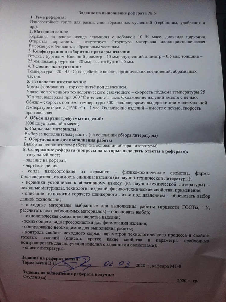 Реферат 1, 2: На тему: Износостойкие сопла для распыления абразивных суспензий вариант 5
