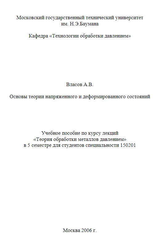 Главная » Учебные материалы » Физика и механика пластических деформаций (ФМПД) (МТ-6) » Книги » МГТУ им. Н.Э.Баумана » 5 семестр » Власов А.В. - Основы теории напряжённого и деформированного состояний