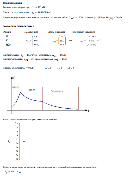 Исходные данные : Тепловая мощность реактора Nт 103 = кВт Плотность энерговыделения q v = 0.001 кВт/см3 Предельно допустимая годовая доза для персонала, при времени работы Tраб = 1700 ч составляет (по НРБ-99) DПДД = 20 мЗв.