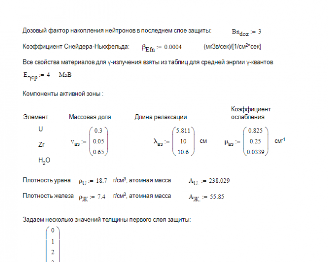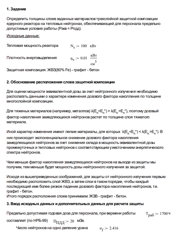1. Задание Определить толщины слоев заданных материалов трехслойной защитной композиции ядерного реактора на тепловых нейтронах, обеспечивающей для персонала предельно допустимые условия работы (Pэкв = Pпдд). Исходные данные: Тепловая мощность реактора Nт 100 кВт Плотность энерговыделения qv 0.01 кВт см 3 Защитная композиция: ЖВЗ(80% Fe) - графит - бетон