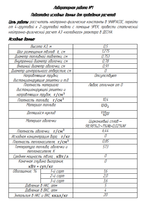 Цель работы: рассчитать нейтронно-физические константы в УНИРАСОС, перейти от 4-групповой к 2-групповой модели с помощью УРЕК, провести статический нейтронно-физический расчет АЗ «холодного» реактора в ДЕСНА