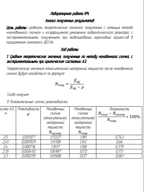 Цель работы: сравнить теоретические значения, полученные с помощью метода «мгновенного скачка» и коэффициента умножения подкритического реактора, с экспериментальными, полученными при моделировании переходных процессов в программном комплексе ДЕСНА