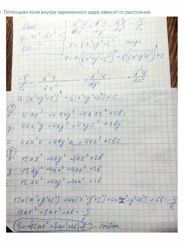 Потенциал поля внутри заряженного шара зависит от расстояния. 1