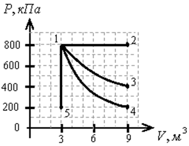 На графике приведена зависимость давления идеального одноатомного газа от температуры. Газ совершает работу, равную 1 кДж. Начальный объем газа равен 10 м3 . Температура газа 300 К. Количество теплоты, полученное газом, равно