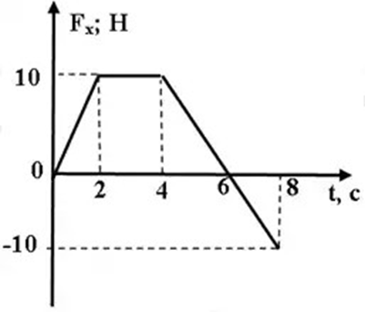На тело массой 6 кг, движущееся со скоростью 2 м/с, начинает действовать сила, график зависимости проекции которой от времени приведен на рисунке. Чему равна проекция скорости этого тела через 8 с?