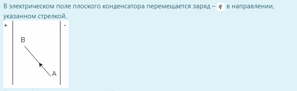 В электрическом поле плоского конденсатора перемещается заряд – в направлении, указанном стрелкой.