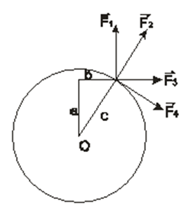 К точке, лежащей на внешней поверхности диска, приложены 4 силы. Если ось вращения проходит через центр О диска перпендикулярно плоскости рисунка, то плечо силы F1 равно…
