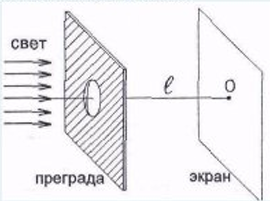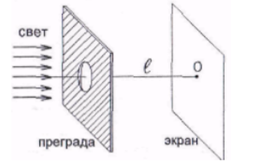 Белый свет падает нормально на плоскую преграду с отверстием. За преградой на удалении l установлен параллельный экран. В центре экрана О из-за дифракции света на отверстии наблюдается максимум освещенности оранжевого света. Экран начинают придвигать к преграде. Цвет пятна в центре экрана может меняться так