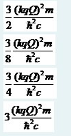 Микрочастица с массой m и с электрическим зарядом -q находится в поле кулоновского притяжения микрочастицы с массой М и с зарядом +Q. При этом M >> m, k = 1/40, c - скорость света. Чтобы перейти с основного, самого низшего разрешенного уровня энергии такой квантовой системы, на соседний разрешенный энергетический уровень, лежащий непосредственно над основным, частица с массой m должна поглотить фотон с импульсом, равным:
