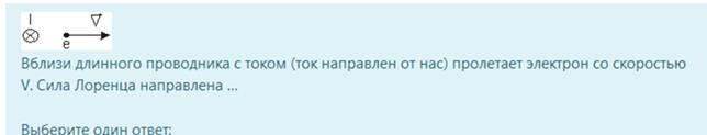 Вблизи длинного проводника с током (ток направлен от нас) пролетает электрон со скоростью V. Сила Лоренца направлена …