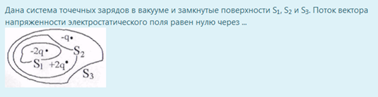 Дана система точечных зарядов в вакууме и замкнутые поверхности S1, S2 и S3. Поток вектора напряженности электростатического поля равен нулю через ...