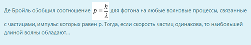 Де Бройль обобщил соотношение p = h/ для фотона на любые волновые процессы, связанные с частицами, импульс которых равен p. Тогда, если скорость частиц одинакова, то наибольшей длиной волны обладаюn