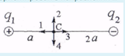 Электрическое поле создано точечными зарядами q1 и q2. Если q1=+q, q2=-4q, точка С находится на расстоянии а от заряда q1 и на расстоянии 2а от q2, то вектор напряженности поля в точке С ориентирован в направлении ...