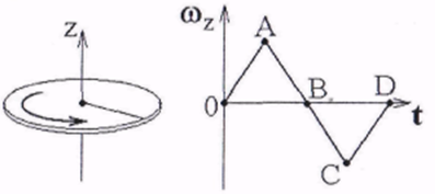 Диск вращается вокруг своей оси, изменяя проекцию своей угловой скорости так, как показано на рисунке. На каком участке графика зависимости ωz(t) вектор угловой скорости w направлен против оси z, а вектор углового ускорения направлен по оси z?