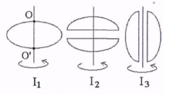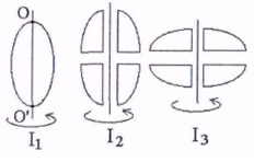 Из жести вырезали три одинаковые детали в виде эллипса. Две детали разрезали пополам вдоль разных осей симметрии. Затем все части отодвинули друг от друга на одинаковое расстояние и расставили симметрично относительно оси ОО' (см. рис.). Выберите правильное соотношение между моментами инерции этих деталей относительно оси ОО'