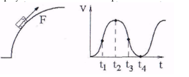 Из-за неисправности мотора величина скорости автомобиля синусоидально изменялась во времени, как показано на графике зависимости V(t). В некоторый момент подъема по участку дуги результирующая всех сил, действующих на автомобиль, была направлена так, как показано на рисунке. Укажите этот момент времени ?