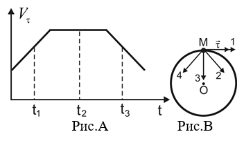 2.1. Материальная точка М движется по окружности со скоростью V. На рис.А показан график зависимости Vt от времени ( t – единичный вектор положительного направления, Vt – проекция V на это направление). На рис.В укажите направление силы, действующей на точку М в момент времени. ![]()