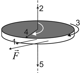 3.2. Колесо вращается так, как показано на рисунке белой стрелкой. К ободу колеса приложена сила, направленная по касательной. Вектор угловой скорости колеса совпадает по направлению с вектором…