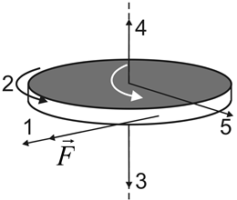 3.3. Колесо вращается так, как показано на рисунке белой стрелкой. К ободу колеса приложена сила, направленная по касательной. Вектор угловой скорости колеса совпадает по направлению с вектором…