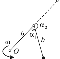 3.26. Два невесомых стержня длиной b соединены под углом α1 = 60o и вращаются без трения в горизонтальной плоскости вокруг вертикальной оси О с угловой скоростью ω. На конце одного из стержней прикреплен очень маленький массивный шарик. В некоторый момент угол между стержнями самопроизвольно увеличился до α2 = 180o. Определите угловую скорость системы.