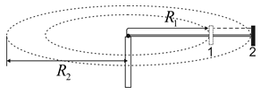 3.28. Вокруг неподвижной оси с угловой скоростью ω1 вращается система: невесомый стержень и массивная шайба, которая удерживается нитью на расстоянии R1 от оси вращения. Отпустив нить, шайбу перевели в положение 2, где она стала двигаться по окружности радиусом R2 = 2R1 с угловой скоростью…