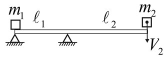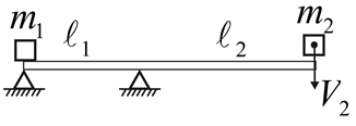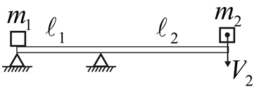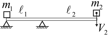 3.34. Невесомая доска покоится на двух опорах. Правая опора делит длину доски в отношении 1/3. На ее правый конец падает и прилипает тело массой m2=1 кг. После удара первое тело движется со скоростью V1=2/3V2. Вычислите массу тела m1.