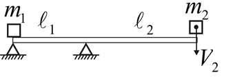 3.32. Невесомая доска покоится на двух опорах. Правая опора делит длину доски в отношении 1/3. На ее правый конец падает и прилипает тело массой m2=2 кг. Если после удара тело массой m1 =1 кг двигается со скоростью V1, то скорость тела 2 в момент удара была равна…