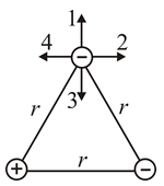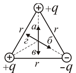 1.2. В вершинах равностороннего треугольника находятся равные по модулю точечные заряды. Определить направление вектора напряженности электростатического поля в центре треугольника.